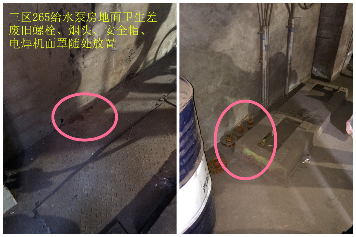 12.265給水泵房地面衛(wèi)生差、廢舊螺栓、煙頭、安全帽、電焊機(jī)面罩隨處放置;