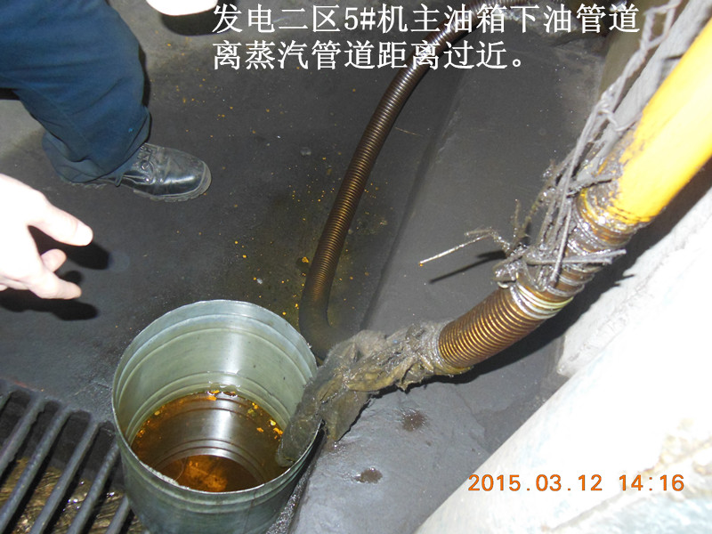 6、 發(fā)電二區(qū)5#機(jī)主油箱下油管道離蒸汽管道距離過(guò)近。