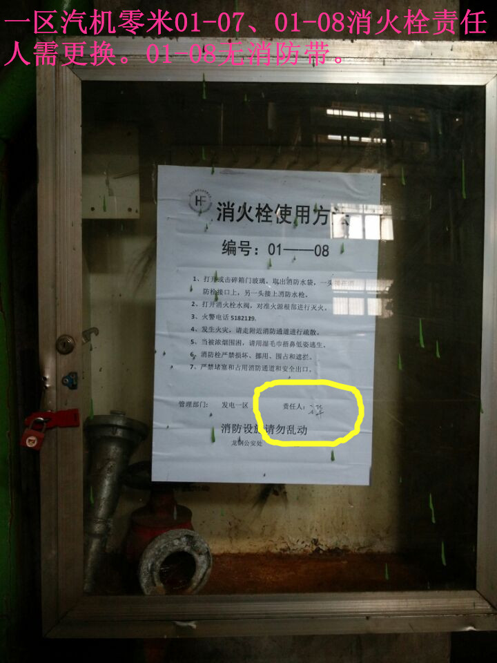 4、汽機(jī)零米01-07、01-08消火栓責(zé)任人需更換。01-08消火栓無(wú)消防帶。
