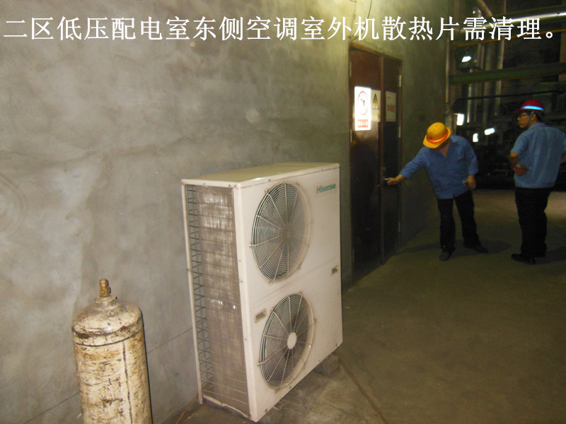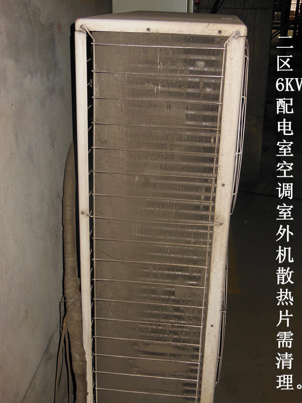 2、 二區(qū)6KV配電室空調(diào)室外機(jī)散熱片,需清理;