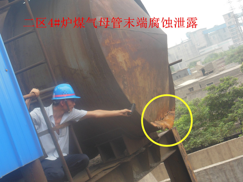 9二區(qū)4#爐煤氣母管末端腐蝕泄露(嚴(yán)重);